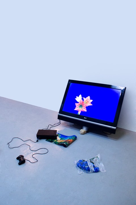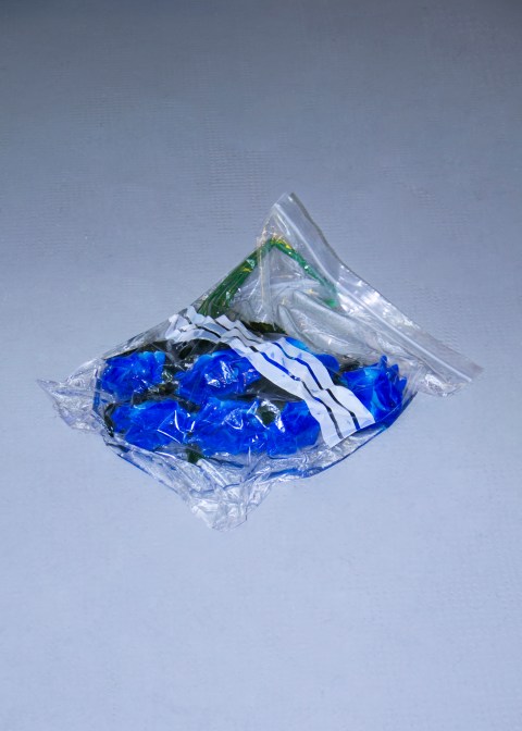 Plastic bag, water, fake blue roses, chipped Play Station 2,